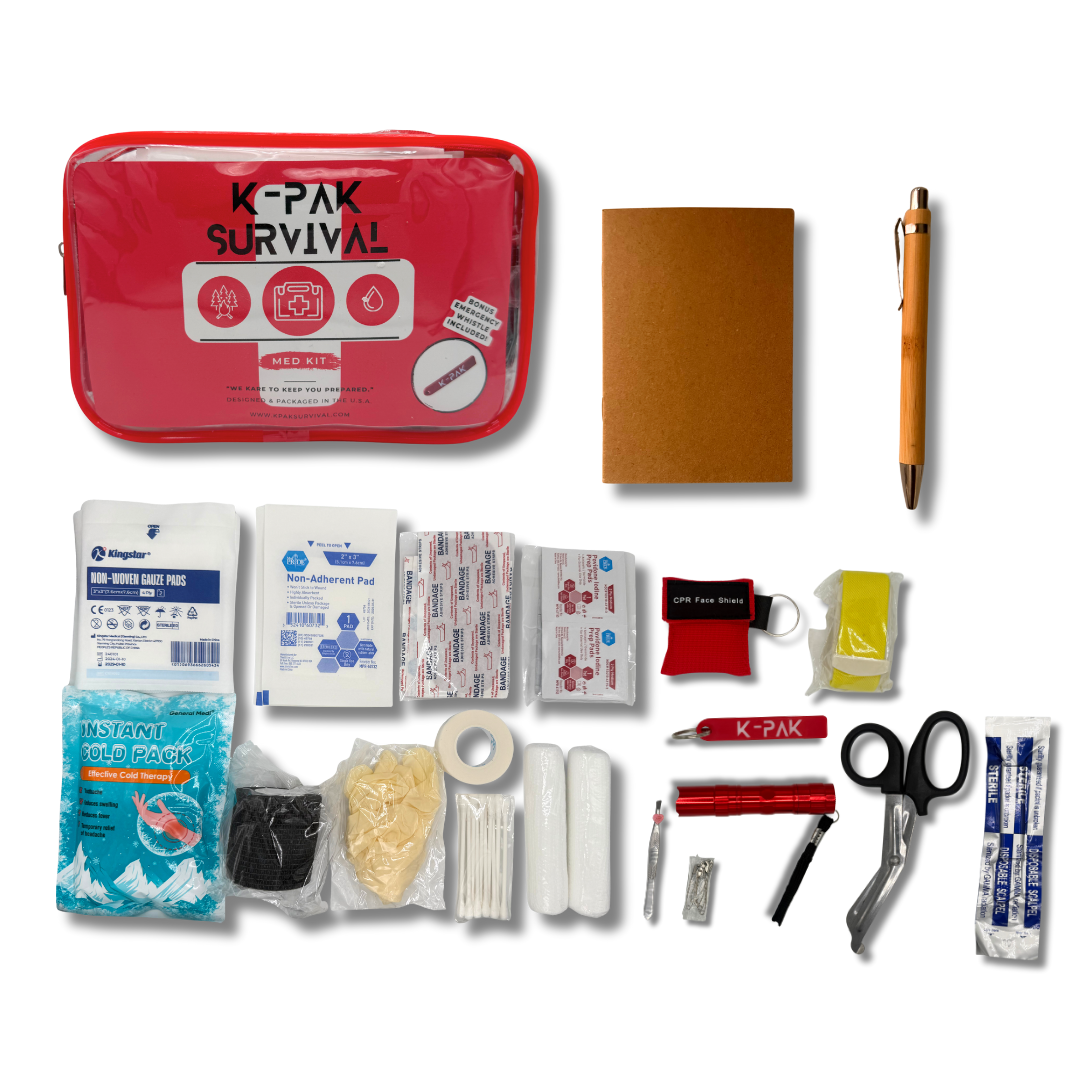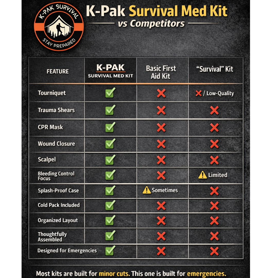 The K-Pak Survival Med Kit is designed around function, not filler. This emergency medical kit includes a practical selection of wound care supplies, emergency medical tools, and essential accessories to support fast response during unexpected situations.